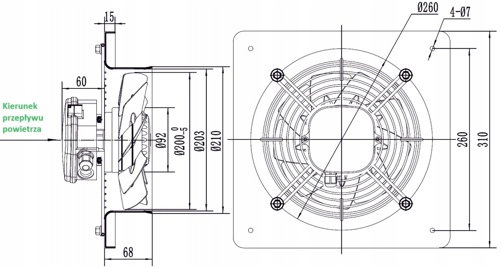 Die YWF-Ventilatoren mit den Durchmessern 200, 250, 300, 350, 400, 450, 500, 550 und 630 mm sind mit Einphasenmotoren ausgestattet – andere Größen sind in anderen Auktionen erhältlich.