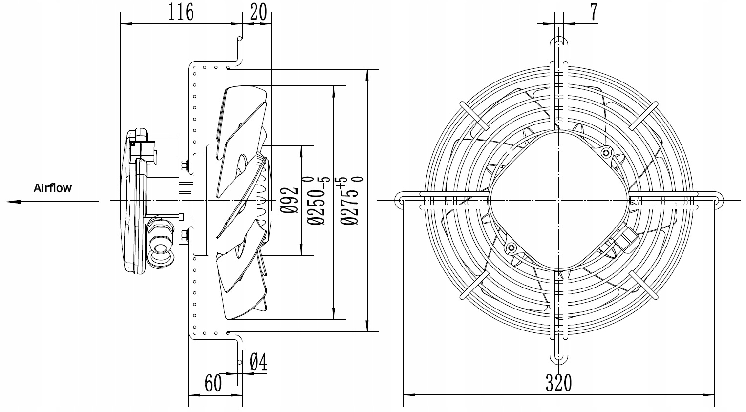 Die YWF-Ventilatoren mit den Durchmessern 250, 300, 350, 400, 450, 500, 550 und 630 sind mit Einphasenmotoren ausgestattet.