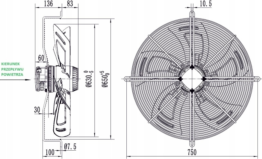 Die YWF-Ventilatoren mit den Durchmessern 250, 300, 350, 400, 450, 500, 550 und 630 mm sind mit Einphasenmotoren ausgestattet.