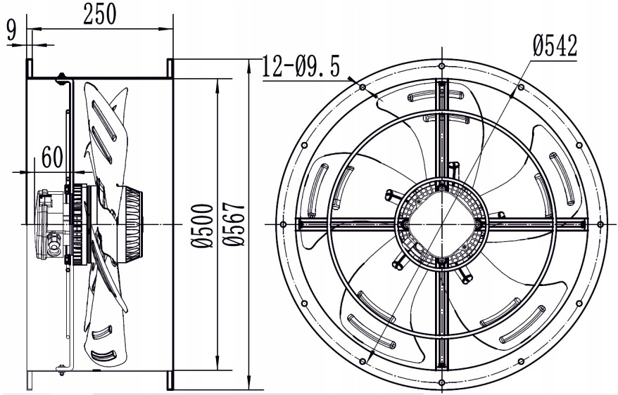 - YWF-Ventilatoren in den Durchmessern 200, 250, 300, 350, 400, 450, 500 haben Einphasenmotoren.