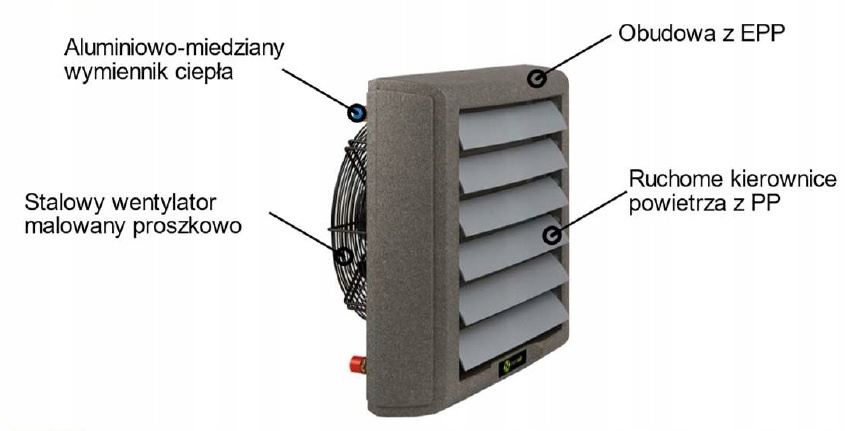 Diese Heizgeräte, auch als Heiz- und Lüftungsgeräte bezeichnet werden, verfügen über einen Strömungswärmetauscher, dessen Träger Warmwasser ist. Der Wärmeaustausch und die Wärmeabgabe erfolgen über hocheffiziente ein- und zweireihige Kupferrohre und Aluminiumlamellen. Die Wärme wird dann mit einem Gebläse durch den Auslass abgegeben. Wenn das Warmwasser abgestellt ist, fungiert die Heizung als Lüftungsgerät, das die Luft im Raum mischt.